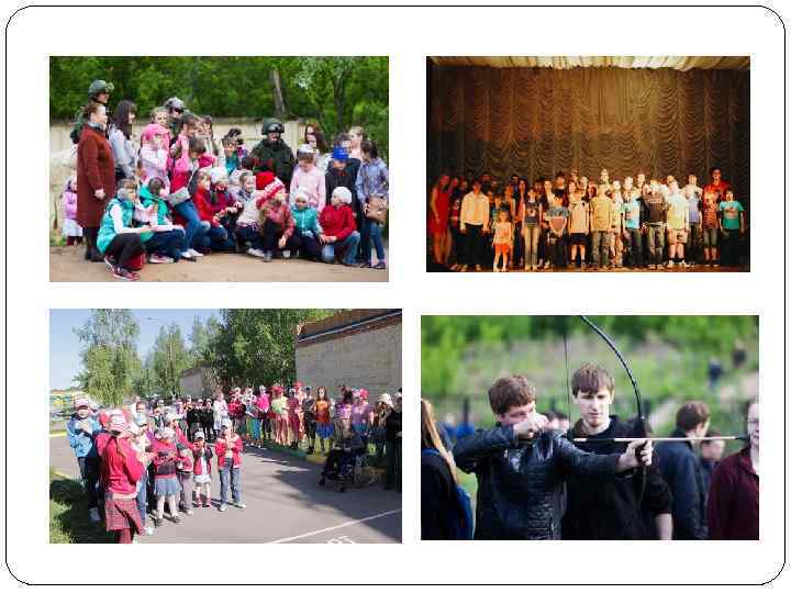Культурно-массовый блок Включает в себя организацию и проведение праздников, выступлений, спортивных и развлекательных мероприятий. - • Спортивные мероприятия; • Организация и проведение праздников и иных развлекательных мероприятий (по одному в месяц); • Военно-патриотическое направление; • Игротеки для воспитанников в возрасте до 10 лет. -