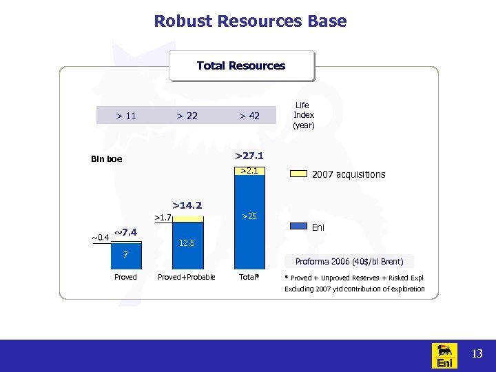 Robust Resources Base Total Resources > 11 > 22 > 42 Life Index (year) >27. 1 Bln boe >2. 1 2007 acquisitions >14. 2 >25 >1. 7 ~0. 4 Eni ~7. 4 12. 5 7 Proved Proforma 2006 (40$/bl Brent) Proved+Probable Total* * Proved + Unproved Reserves + Risked Expl. Excluding 2007 ytd contribution of exploration 13