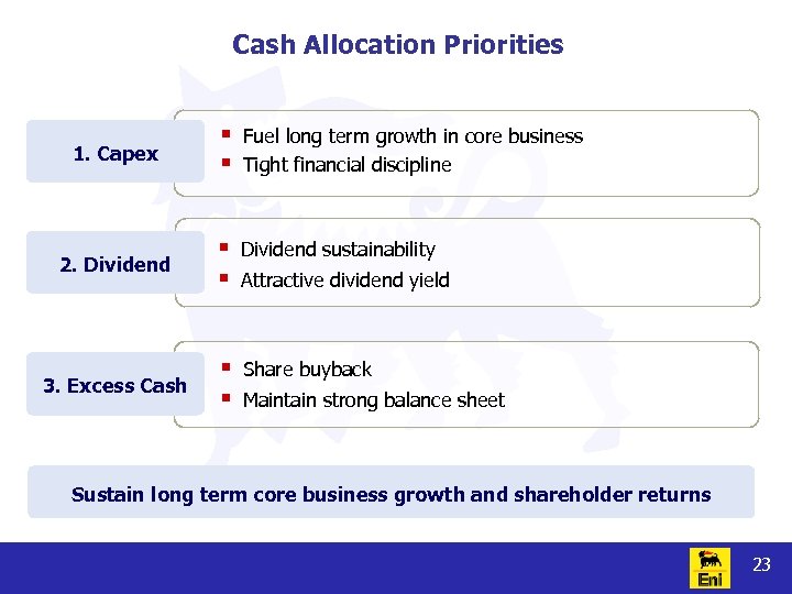 Eastern Europe Downstream Activities Acquired assets § § 102 retail stations in Czech Republic, Slovakia, Hungary 16. 11% stake in Czech Refining Company § Financial Impact 15 § Increase local refining capacity to 2. 6 mln tons per year § Industrial Rationale Enhance Eni’s integrated marketing and refining activities Improve network quality: 4. 9 mln lt/y throughput per site § § Synergies EPS accretive 22