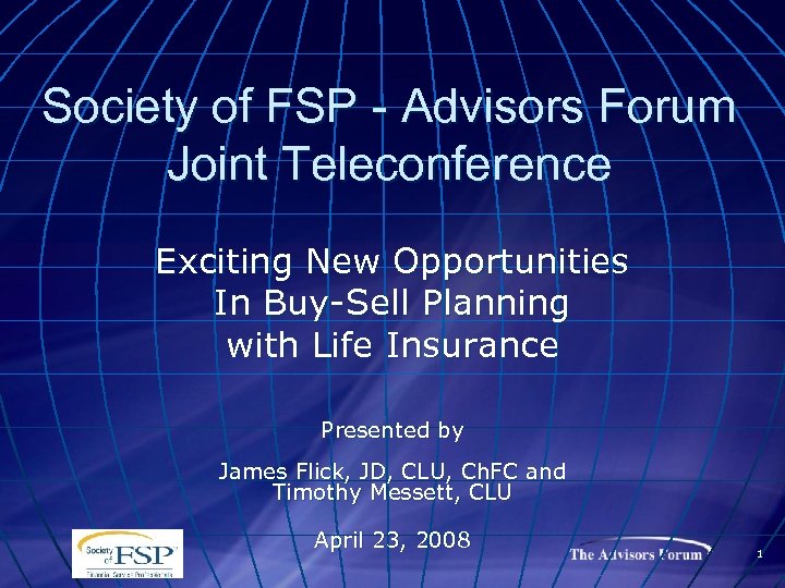 Society of FSP - Advisors Forum Joint Teleconference Exciting New Opportunities In Buy-Sell Planning with Life Insurance Presented by James Flick, JD, CLU, Ch. FC and Timothy Messett, CLU April 23, 2008 1