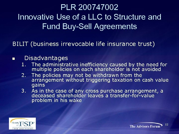 PLR 200747002 Innovative Use of a LLC to Structure and Fund Buy-Sell Agreements The BILIT (business irrevocable life insurance trust) The BILIT uses irrevocable life insurance trusts ( ILITs) as the centerpiece of the buy-sell arrangement. This strategy calls for a cross purchase arrangement whereby the policies each shareholder maintains on the other shareholders are held in their own respective ILITs. n Advantages 1. 2. Policies are protected from shareholder’s creditors Policies are not an asset in shareholder’s estate 11
