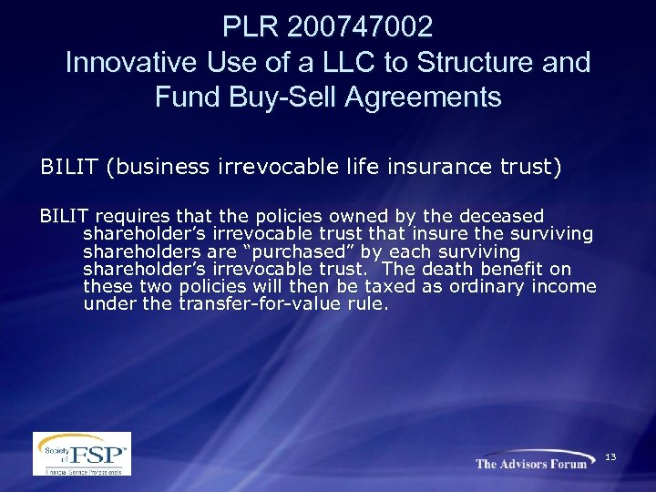 PLR 200747002 Innovative Use of a LLC to Structure and Fund Buy-Sell Agreements BILIT (business irrevocable life insurance trust) n Disadvantages 1. 2. 3. The administrative inefficiency caused by the need for multiple policies on each shareholder is not avoided The policies may not be withdrawn from the arrangement without triggering taxation on cash value gains As in the case of any cross purchase arrangement, a deceased shareholder leaves a transfer-for-value problem in his wake 12