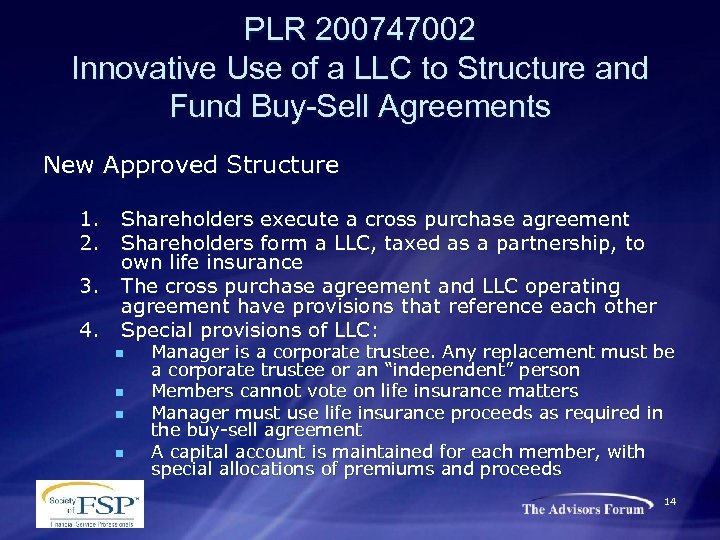 PLR 200747002 Innovative Use of a LLC to Structure and Fund Buy-Sell Agreements BILIT (business irrevocable life insurance trust) BILIT requires that the policies owned by the deceased shareholder’s irrevocable trust that insure the surviving shareholders are “purchased” by each surviving shareholder’s irrevocable trust. The death benefit on these two policies will then be taxed as ordinary income under the transfer-for-value rule. 13