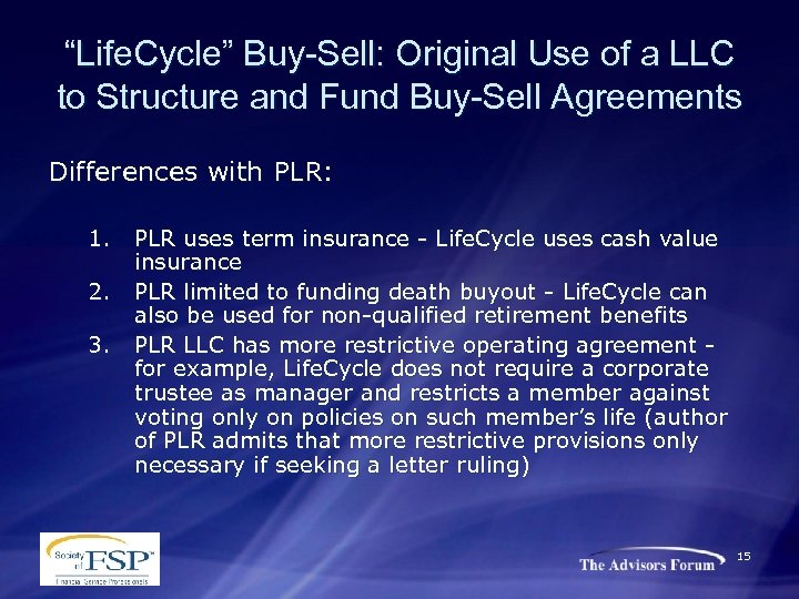PLR 200747002 Innovative Use of a LLC to Structure and Fund Buy-Sell Agreements New Approved Structure 1. 2. 3. 4. Shareholders execute a cross purchase agreement Shareholders form a LLC, taxed as a partnership, to own life insurance The cross purchase agreement and LLC operating agreement have provisions that reference each other Special provisions of LLC: n n Manager is a corporate trustee. Any replacement must be a corporate trustee or an “independent” person Members cannot vote on life insurance matters Manager must use life insurance proceeds as required in the buy-sell agreement A capital account is maintained for each member, with special allocations of premiums and proceeds 14