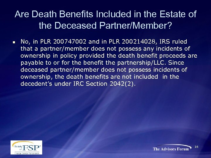 Are Death Benefits Included in the Estate of the Deceased Partner/Member? n No, in PLR 200747002 and in PLR 200214028, IRS ruled that a partner/member does not possess any incidents of ownership in policy provided the death benefit proceeds are payable to or for the benefit the partnership/LLC. Since deceased partner/member does not possess incidents of ownership, the death benefits are not included in the decedent’s under IRC Section 2042(2). 16