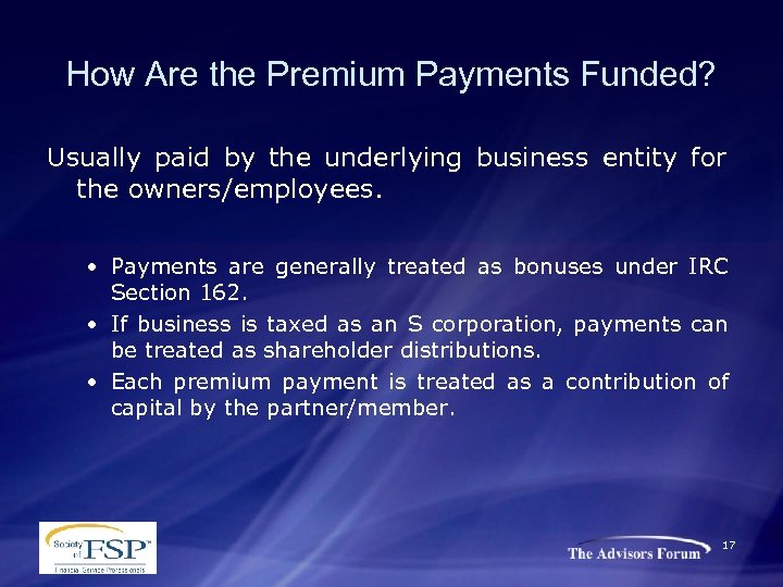 How Are the Premium Payments Funded? Usually paid by the underlying business entity for the owners/employees. • Payments are generally treated as bonuses under IRC Section 162. • If business is taxed as an S corporation, payments can be treated as shareholder distributions. • Each premium payment is treated as a contribution of capital by the partner/member. 17