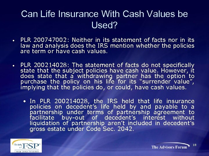 Can Life Insurance With Cash Values be Used? • • PLR 200747002: Neither in its statement of facts nor in its law and analysis does the IRS mention whether the policies are term or have cash values. PLR 200214028: The statement of facts do not specifically state that the subject policies have cash value. However, it does state that a withdrawing partner has the option to purchase the policy on his life for its “surrender value”, implying that the policies do, or could, have cash values. • In PLR 200214028, the IRS held that life insurance policies on decedent’s life held by and payable to a partnership under terms of partnership agreement to facilitate buy-out of decedent’s interest without liquidation of partnership aren’t included in decedent’s gross estate under Code Sec. 2042. 18