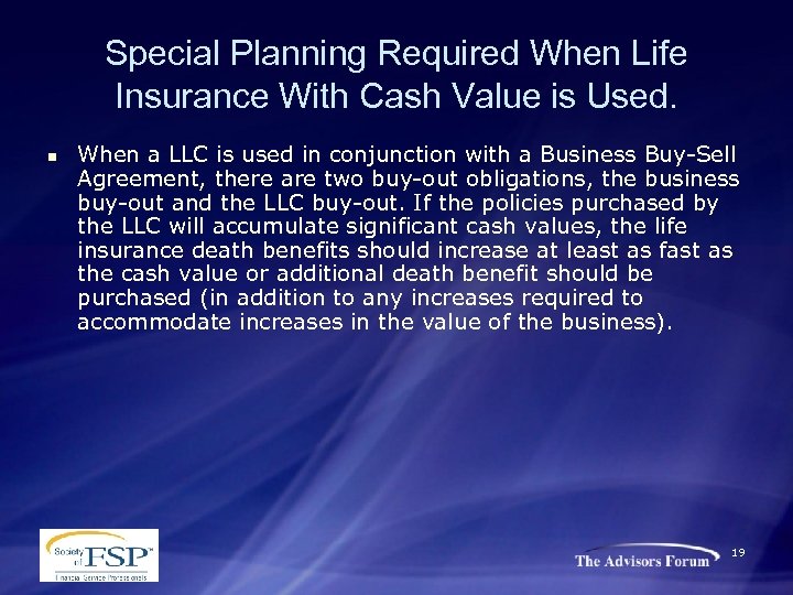 Special Planning Required When Life Insurance With Cash Value is Used. n When a LLC is used in conjunction with a Business Buy-Sell Agreement, there are two buy-out obligations, the business buy-out and the LLC buy-out. If the policies purchased by the LLC will accumulate significant cash values, the life insurance death benefits should increase at least as fast as the cash value or additional death benefit should be purchased (in addition to any increases required to accommodate increases in the value of the business). 19