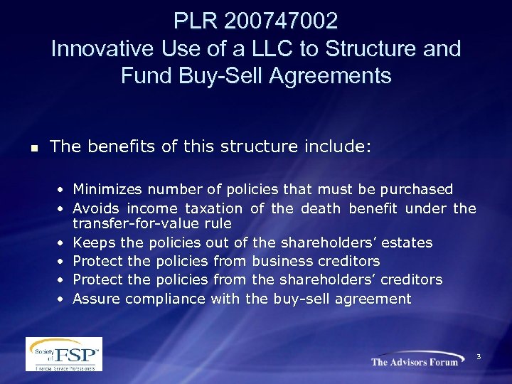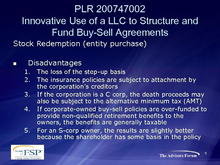 PLR 200747002 Innovative Use of a LLC to Structure and Fund Buy-Sell Agreements Background on Buy-Sell Planning n Stock Redemption (entity purchase) • n Under a redemption arrangement, the corporation redeems the shares of a deceased shareholder at his death Advantages 1. 2. 3. The simplicity of only one life insurance policy per shareholder Premium costs are allocated to the shareholders according to their percentage ownership in the corporation Assumes compliance with the terms of the buy-sell 4