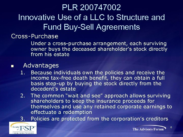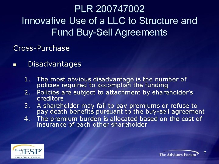 PLR 200747002 Innovative Use of a LLC to Structure and Fund Buy-Sell Agreements Cross-Purchase Under a cross-purchase arrangement, each surviving owner buys the deceased shareholder’s stock directly from his estate n Advantages 1. 2. 3. Because individuals own the policies and receive the income tax-free death benefit, they can obtain a full basis step-up by buying the stock directly from the decedent’s estate The common “wait and see” approach allows surviving shareholders to keep the insurance proceeds for themselves and use any retained corporate earnings to effectuate a redemption Policies are protected from the corporation’s creditors 6
