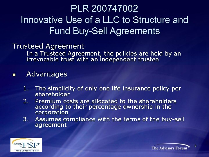 PLR 200747002 Innovative Use of a LLC to Structure and Fund Buy-Sell Agreements Cross-Purchase n Disadvantages 1. 2. 3. 4. The most obvious disadvantage is the number of policies required to accomplish the funding Policies are subject to attachment by shareholder’s creditors A shareholder may fail to pay premiums or refuse to pay death benefits pursuant to the buy-sell agreement The premium burden is allocated based on the cost of insurance of each other shareholder 7