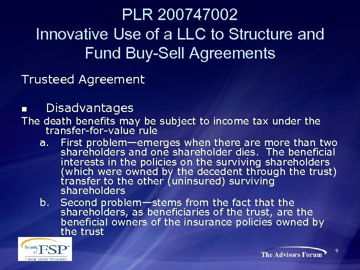 PLR 200747002 Innovative Use of a LLC to Structure and Fund Buy-Sell Agreements Trusteed Agreement In a Trusteed Agreement, the policies are held by an irrevocable trust with an independent trustee n Advantages 1. 2. 3. The simplicity of only one life insurance policy per shareholder Premium costs are allocated to the shareholders according to their percentage ownership in the corporation Assumes compliance with the terms of the buy-sell agreement 8