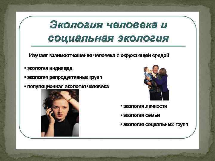 Цели и задачи экологии человека Цель экологии человека – обеспечить общество соответствующеи информациеи , способствующеи оптимизации жизненнои среды человека и процессов, протекающих в самом человеке как биологическом и одновременно социальном существе, человеческом обществе и среде обитания человека и общества. Практическая задача экологии человека – создание на всеи территории страны здоровои , экологически чистои , безопаснои и социально комфортнои среды обитания человека.