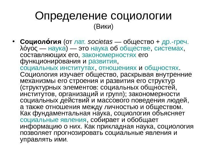 Определение социологии (Вики) • Социол гияоо (от лат. societas — общество + др. -греч. λόγος — наука ) — это наука об обществе , системах , составляющих его, закономерностях его функционирования и развития , социальных институтах , отношениях и общностях. Социология изучает общество, раскрывая внутренние механизмы его строения и развития его структур (структурных элементов: социальных общностей, институтов, организаций и групп); закономерности социальных действий и массового поведения людей, а также отношения между личностью и обществом. Как фундаментальная наука, социология объясняет социальные явления , собирает и обобщает информацию о них. Как прикладная наука, социология позволяет прогнозировать социальные явления и управлять ими.