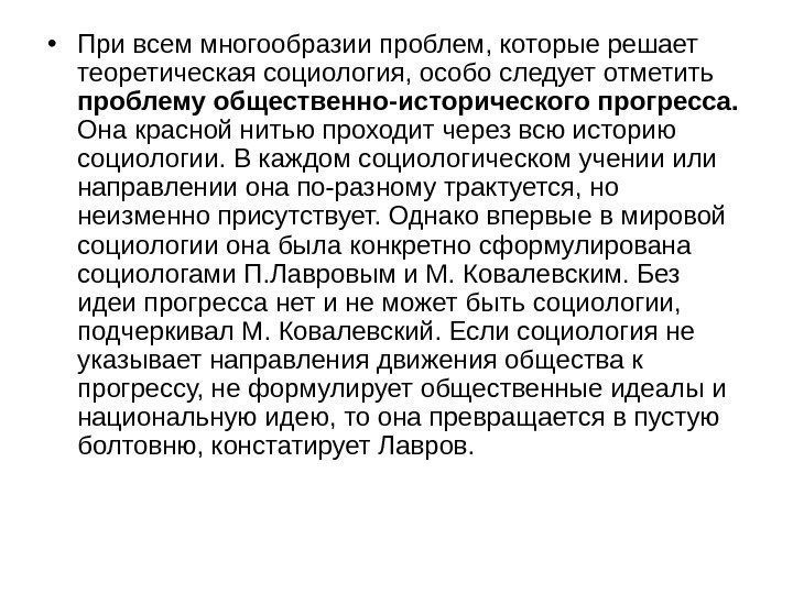 • При всем многообразии проблем, которые решает теоретическая социология, особо следует отметить проблему общественно-исторического прогресса. Она красной нитью проходит через всю историю социологии. В каждом социологическом учении или направлении она по-разному трактуется, но неизменно присутствует. Однако впервые в мировой социологии она была конкретно сформулирована социологами П. Лавровым и М. Ковалевским. Без идеи прогресса нет и не может быть социологии, подчеркивал М. Ковалевский. Если социология не указывает направления движения общества к прогрессу, не формулирует общественные идеалы и национальную идею, то она превращается в пустую болтовню, констатирует Лавров.