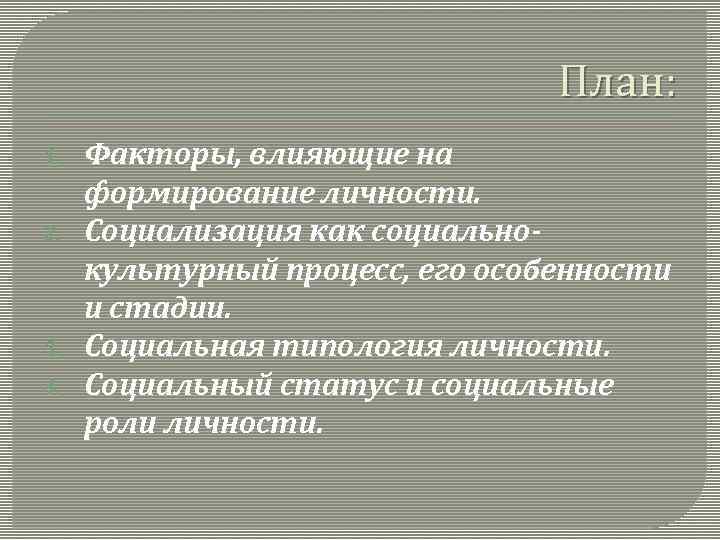 План: 1. 2. 3. 4. Факторы, влияющие на формирование личности. Социализация как социальнокультурный процесс, его особенности и стадии. Социальная типология личности. Социальный статус и социальные роли личности.