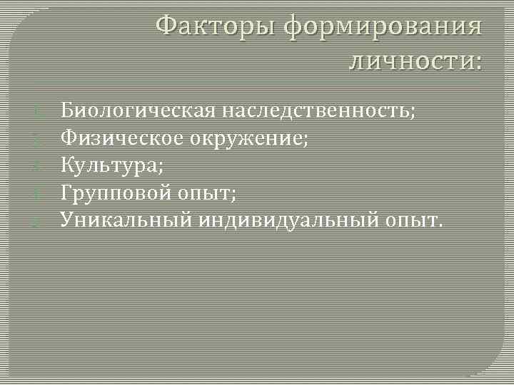 Факторы формирования личности: 1. 2. 3. 4. 5. Биологическая наследственность; Физическое окружение; Культура; Групповой опыт; Уникальный индивидуальный опыт.