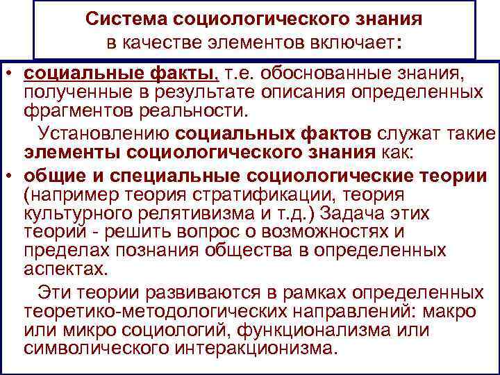Система социологического знания в качестве элементов включает: • социальные факты, т. е. обоснованные знания, полученные в результате описания определенных фрагментов реальности. Установлению социальных фактов служат такие элементы социологического знания как: • общие и специальные социологические теории (например теория стратификации, теория культурного релятивизма и т. д. ) Задача этих теорий - решить вопрос о возможностях и пределах познания общества в определенных аспектах. Эти теории развиваются в рамках определенных теоретико-методологических направлений: макро или микро социологий, функционализма или символического интеракционизма.