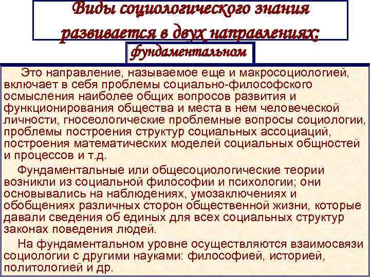 Виды социологического знания развивается в двух направлениях: фундаментальном Это направление, называемое еще и макросоциологией, включает в себя проблемы социально-философского осмысления наиболее общих вопросов развития и функционирования общества и места в нем человеческой личности, гносеологические проблемные вопросы социологии, проблемы построения структур социальных ассоциаций, построения математических моделей социальных общностей и процессов и т. д. Фундаментальные или общесоциологические теории возникли из социальной философии и психологии; они основывались на наблюдениях, умозаключениях и обобщениях различных сторон общественной жизни, которые давали сведения об единых для всех социальных структур законах поведения людей. На фундаментальном уровне осуществляются взаимосвязи социологии с другими науками: философией, историей, политологией и др.