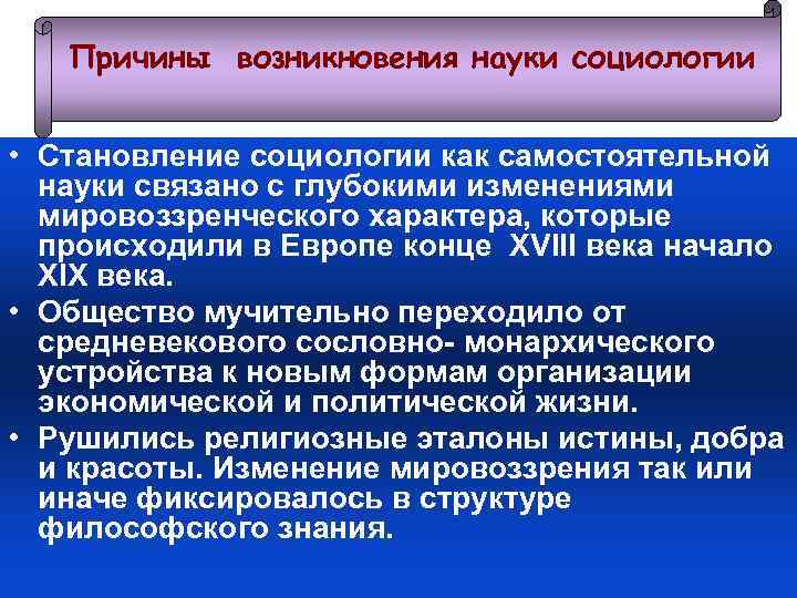 Причины возникновения науки социологии • Становление социологии как самостоятельной науки связано с глубокими изменениями мировоззренческого характера, которые происходили в Европе конце XVIII века начало XIX века. • Общество мучительно переходило от средневекового сословно- монархического устройства к новым формам организации экономической и политической жизни. • Рушились религиозные эталоны истины, добра и красоты. Изменение мировоззрения так или иначе фиксировалось в структуре философского знания.