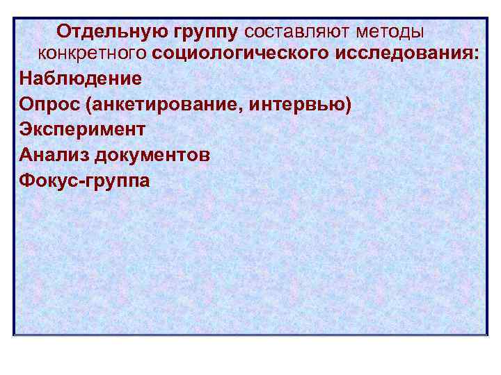 Отдельную группу составляют методы конкретного социологического исследования: Наблюдение Опрос (анкетирование, интервью) Эксперимент Анализ документов Фокус-группа