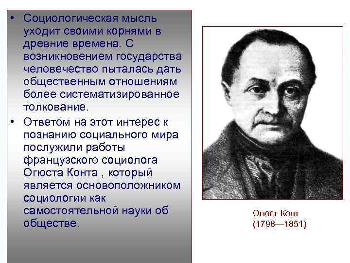 • Социологическая мысль уходит своими корнями в древние времена. С возникновением государства человечество пыталась дать общественным отношениям более систематизированное толкование. • Ответом на этот интерес к познанию социального мира послужили работы французского социолога Огюста Конта , который является основоположником социологии как самостоятельной науки об обществе. Огюст Конт (1798— 1851)