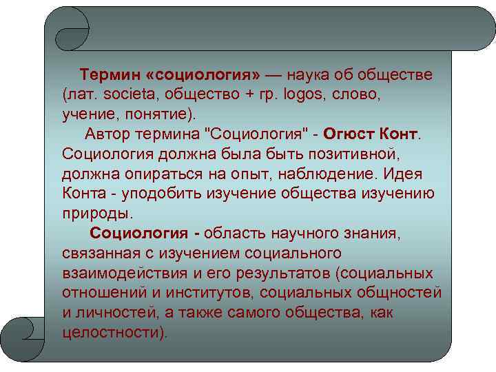 Термин «социология» — наука об обществе (лат. societa, общество + гр. logos, слово, учение, понятие). Автор термина "Социология" - Огюст Конт. Социология должна была быть позитивной, должна опираться на опыт, наблюдение. Идея Конта - уподобить изучение общества изучению природы. Социология - область научного знания, связанная с изучением социального взаимодействия и его результатов (социальных отношений и институтов, социальных общностей и личностей, а также самого общества, как целостности).