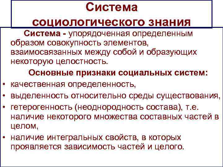 Система социологического знания • • Система - упорядоченная определенным образом совокупность элементов, взаимосвязанных между собой и образующих некоторую целостность. Основные признаки социальных систем: качественная определенность, выделенность относительно среды существования, гетерогенность (неоднородность состава), т. е. наличие некоторого множества составных частей в целом, наличие интегральных свойств, в которых проявляется зависимость частей и целого.