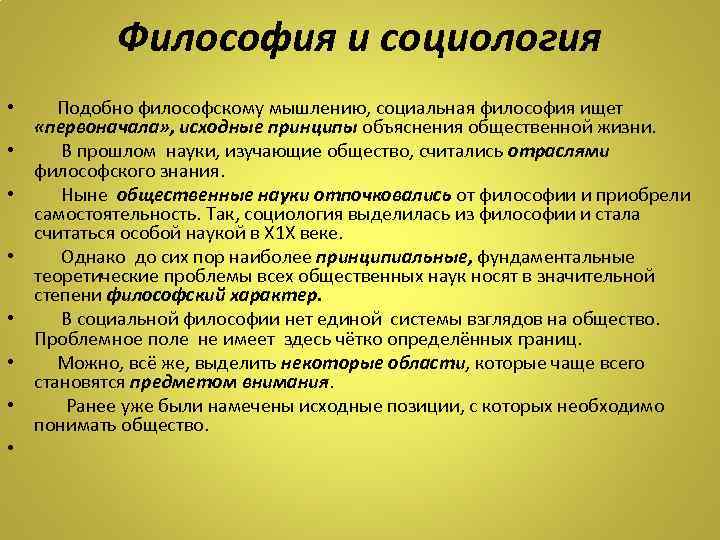 Философия и социология • Подобно философскому мышлению, социальная философия ищет «первоначала» , исходные принципы объяснения общественной жизни. • В прошлом науки, изучающие общество, считались отраслями философского знания. • Ныне общественные науки отпочковались от философии и приобрели самостоятельность. Так, социология выделилась из философии и стала считаться особой наукой в Х 1 Х веке. • Однако до сих пор наиболее принципиальные, фундаментальные теоретические проблемы всех общественных наук носят в значительной степени философский характер. • В социальной философии нет единой системы взглядов на общество. Проблемное поле не имеет здесь чётко определённых границ. • Можно, всё же, выделить некоторые области, которые чаще всего становятся предметом внимания. • Ранее уже были намечены исходные позиции, с которых необходимо понимать общество. •