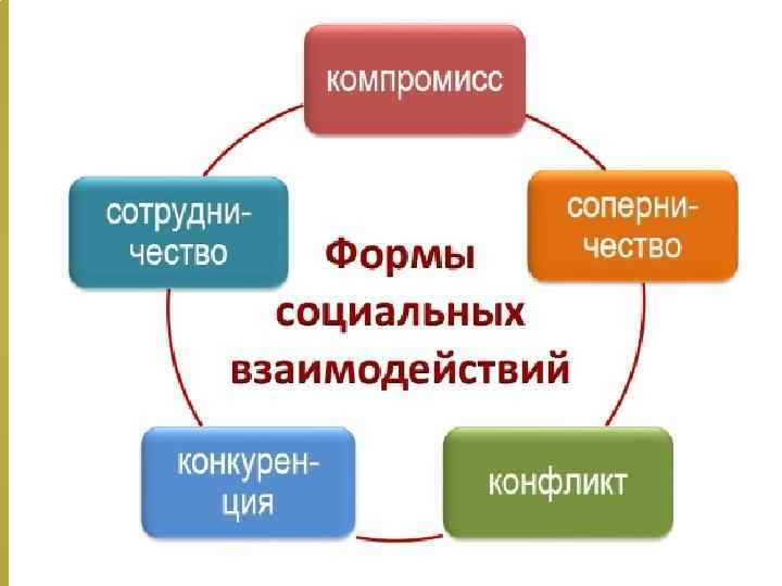 Формы взаимодействия • В стремлении к достижению ценностей люди вступают в конфликтные взаимодействия, если они считают существующий ценностный образец несправедливым, и активно пытаются изменить собственные ценностные позиции. • Они также используют кооперативные взаимодействия, если ценностный образец их устраивает или если надо вступать в коалиции против других личностей или групп. • Наконец, люди вступают во взаимодействия в форме уступок, если ценностный образец считается несправедливым, но часть членов группы по разным причинам не стремятся изменить существующее положение.