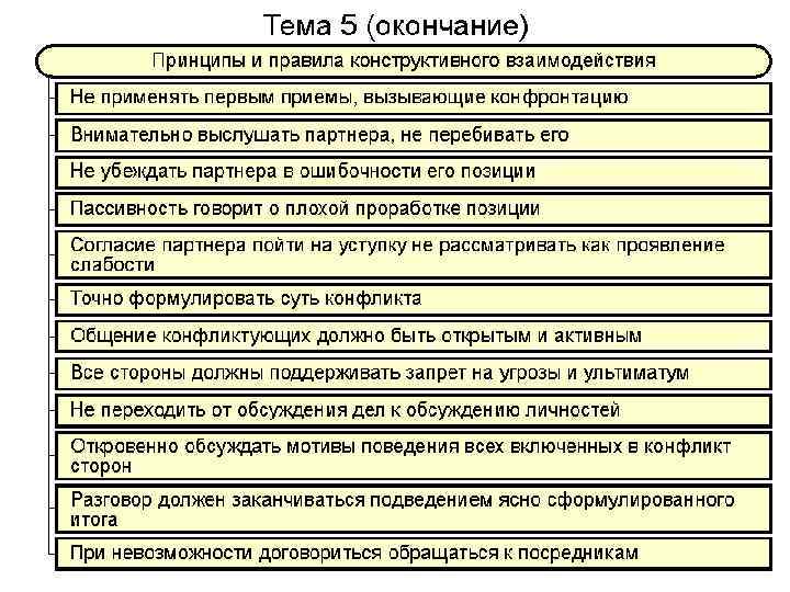Сетка Томаса - Килменна Высокий 1 2 РАЗРЕШЕНИЕ КОНФЛИКТА СИЛОЙ РАЗРЕШЕНИЕ КОНФЛИКТА ЧЕРЕЗ СОТРУДНИЧЕСТВО (выигрыш - проигрыш) (выигрыш - выигрыш) РАЗРЕШЕНИЕ КОНФЛИКТА ЧЕРЕЗ КОМПРОМИСС Интерес к себе 5 (непроигрыш – невыигрыш) УХОД ОТ КОНФЛИКТА (проигрыш - проигрыш) Низкий ВОЙТИ В ПОЛОЖЕНИЕ ДРУГОЙ СТОРОНЫ (невыигрыш - выигрыш) 3 4