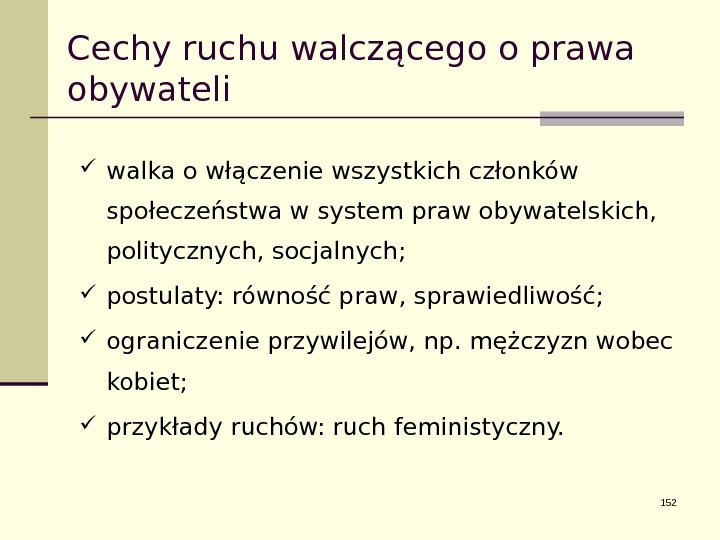 Cechy ruchu walczącego o prawa obywateli walka o włączenie wszystkich członków społeczeństwa w system praw obywatelskich, politycznych, socjalnych; postulaty: równość praw, sprawiedliwość; ograniczenie przywilejów, np. mężczyzn wobec kobiet; przykłady ruchów: ruch feministyczny.