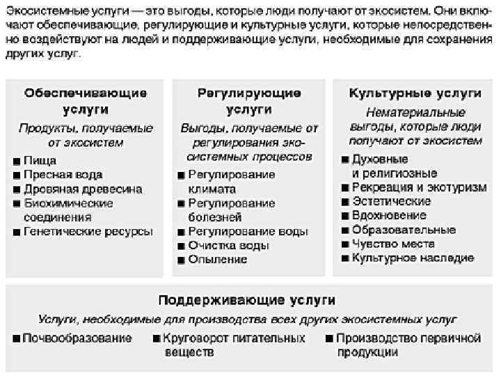 Определение некоторых из ключевых понятий курса — Природный капитал — до Всемирного Саммита в Рио-де-Жанейро (1992) рассматривался как совокупность природных ресурсов, которые используются для производства рыночных товаров и услуг. После Рио ПК трактуется как совокупность «природных активов» , представляющих человечеству наряду с ресурсами природы и экологические услуги или экосистемные услуги. — Экосистемные услуги — выгоды, которые люди получают от экосистем. Они включают обеспечивающие услуги, такие как пища и вода; регулирующие услуги, такие как контроль наводнений и болезней; культурные услуги, такие как природные красоты, духовные, рекреационные и культурные выгоды; поддерживающие услуги, такие как круговорот питательных веществ, устойчивость природных сред, обеспечение циклов питания, способность экосистем к ассимиляции загрязнений, биоразнообразие, генетическая библиотека и т. д.