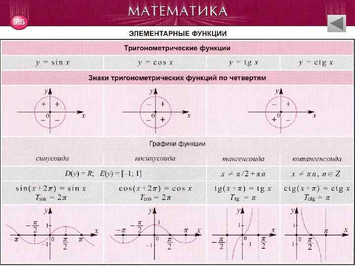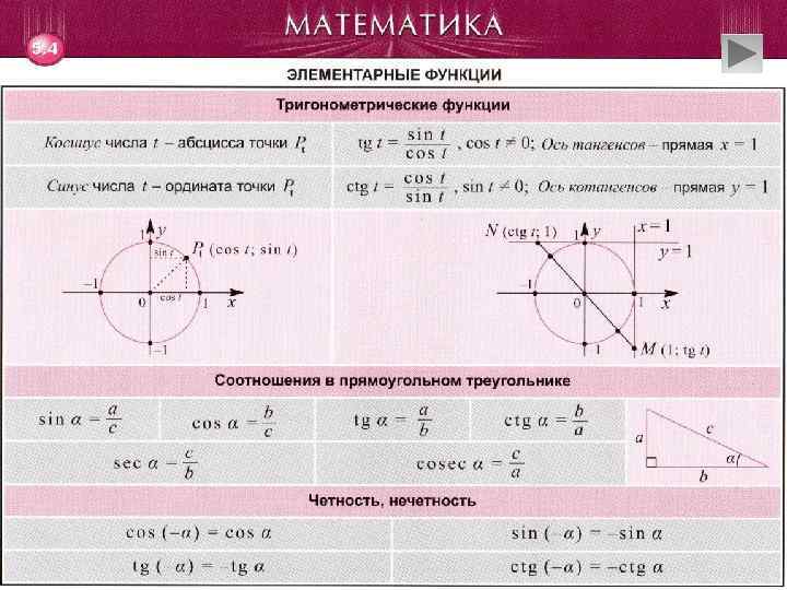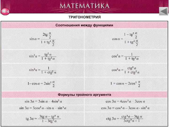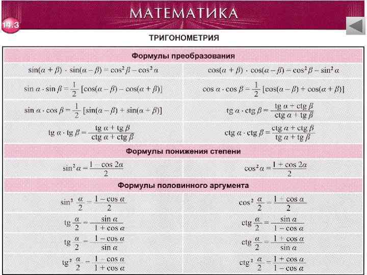 Тригонометрия • Основные формулы. Формулы приведения. Формулы сложения • Формулы двойного аргумента. Формулы суммы и разности тригонометрических функций • Формулы преобразования. Формулы понижения степени. Формулы половинного аргумента • Соотношения между функциями. Формулы тройного аргумента