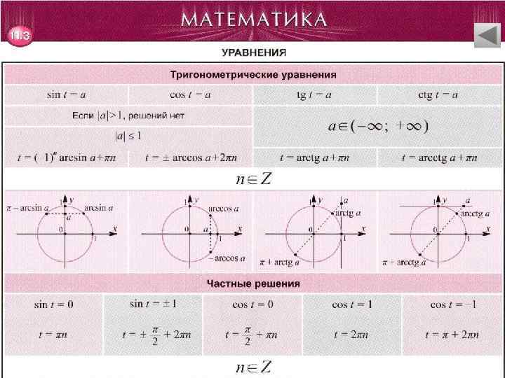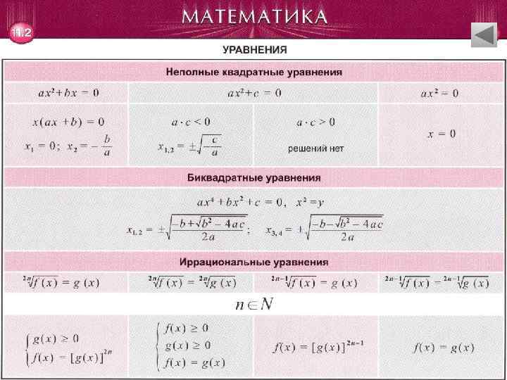 Уравнения • Линейные и квадратные уравнения • Неполные квадратные уравнения. Биквадратные уравнения. Иррациональные уравнения • Тригонометрические уравнения • Показательные и логарифмические уравнения