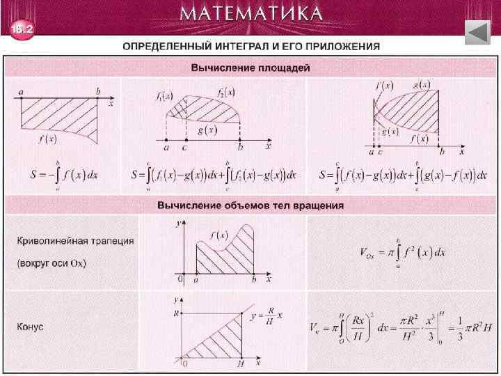 Определённый интеграл и его приложения • Формула Ньютона-Лейбница. Свойства. Вычисление площадей • Вычисление площадей. Вычисление объёмов тел вращения