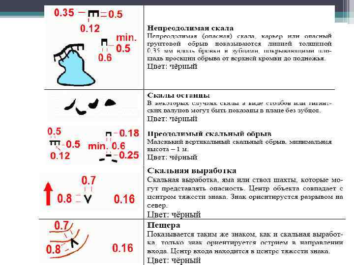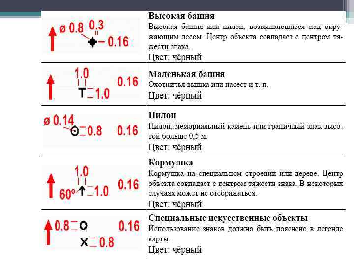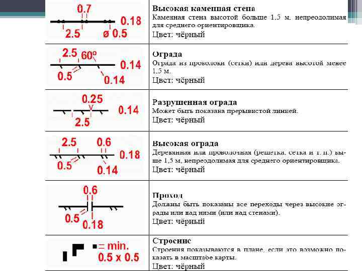 • Черный – это цвет для нанесения строений, изгородей, границ разной растительности, сети дорог, троп, а также скал и камней.