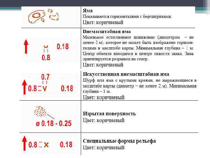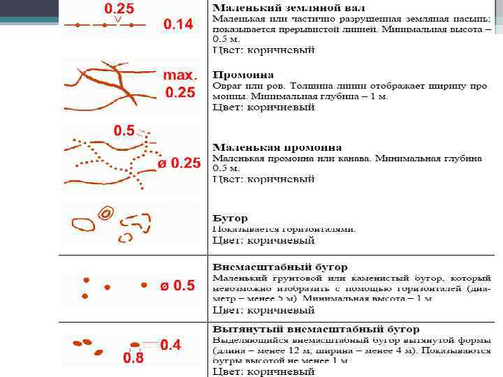 • Коричневый цвет используется для изображения любых форм рельефа (кроме скальных пород), шоссейных дорог и асфальтированных территорий.