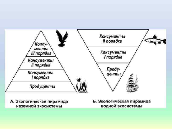 Экологические пирамиды Экологическая пирамида — графическое изображение соотношения между продуцентами и консументами всех уровней (травоядных, хищников, видов, питающихся другими хищниками) в экосистеме.