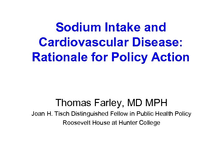 Sodium Intake and Cardiovascular Disease: Rationale for Policy Action Thomas Farley, MD MPH Joan H. Tisch Distinguished Fellow in Public Health Policy Roosevelt House at Hunter College