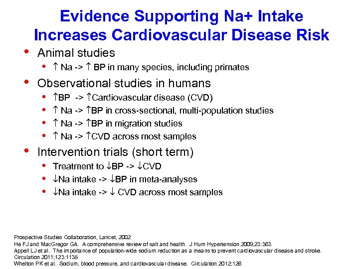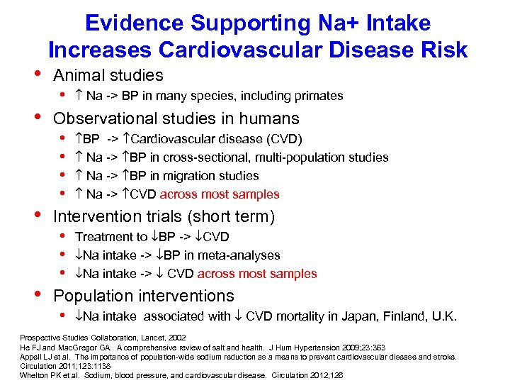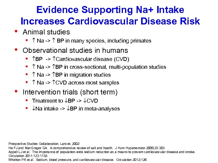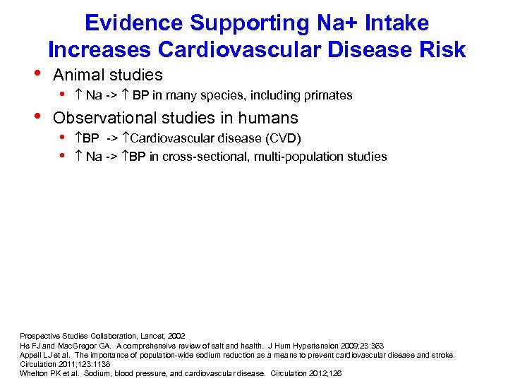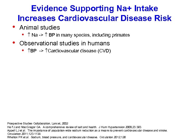 • • Evidence Supporting Na+ Intake Increases Cardiovascular Disease Risk Animal studies • Na -> BP in many species, including primates Observational studies in humans • BP -> Cardiovascular disease (CVD) Prospective Studies Collaboration, Lancet, 2002 He FJ and Mac. Gregor GA. A comprehensive review of salt and health. J Hum Hypertension 2009; 23: 363 Appell LJ et al. The importance of population-wide sodium reduction as a means to prevent cardiovascular disease and stroke. Circulation 2011; 123: 1138 Whelton PK et al. Sodium, blood pressure, and cardiovascular disease. Circulation 2012; 126