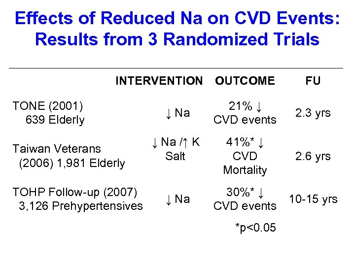 Effects of Reduced Na on CVD Events: Results from 3 Randomized Trials INTERVENTION OUTCOME TONE (2001) 639 Elderly Taiwan Veterans (2006) 1, 981 Elderly TOHP Follow-up (2007) 3, 126 Prehypertensives ↓ Na /↑ K Salt ↓ Na FU 21% ↓ CVD events 2. 3 yrs 41%* ↓ CVD Mortality 2. 6 yrs 30%* ↓ CVD events 10 -15 yrs *p<0. 05
