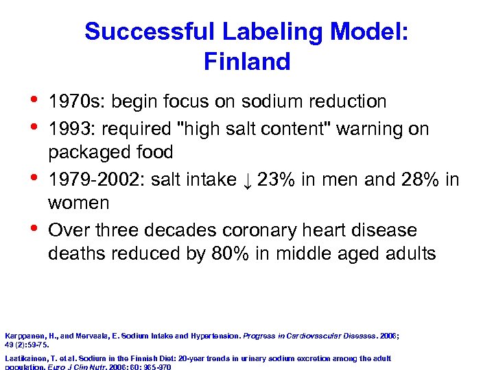 Successful Labeling Model: Finland • • 1970 s: begin focus on sodium reduction 1993: required "high salt content" warning on packaged food 1979 -2002: salt intake ↓ 23% in men and 28% in women Over three decades coronary heart disease deaths reduced by 80% in middle aged adults Karppanen, H. , and Mervaala, E. Sodium Intake and Hypertension. Progress in Cardiovascular Diseases. 2006; 49 (2): 59 -75. Laatikainen, T. et al. Sodium in the Finnish Diet: 20 -year trends in urinary sodium excretion among the adult