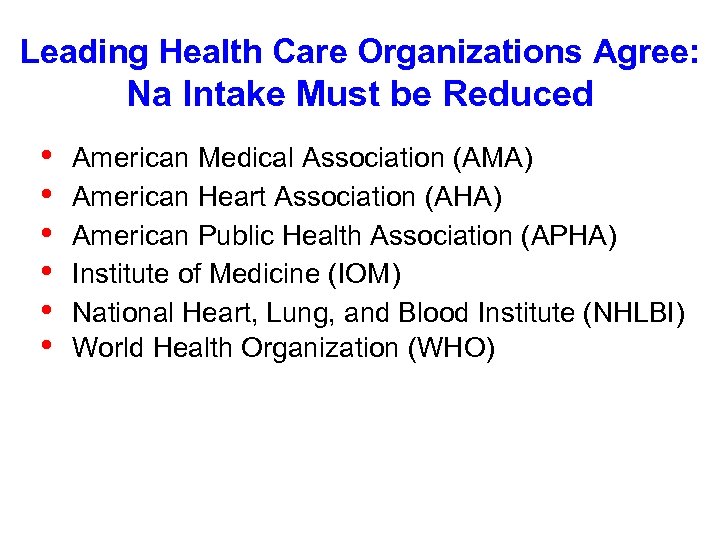 Leading Health Care Organizations Agree: Na Intake Must be Reduced • • • American Medical Association (AMA) American Heart Association (AHA) American Public Health Association (APHA) Institute of Medicine (IOM) National Heart, Lung, and Blood Institute (NHLBI) World Health Organization (WHO)