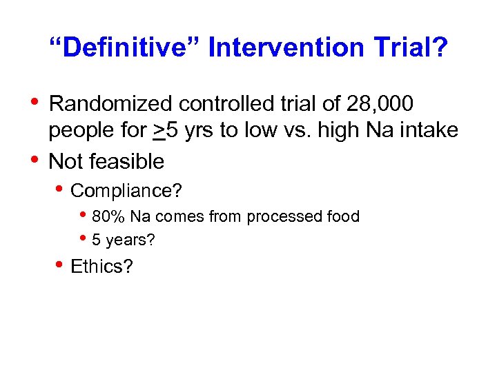 “Definitive” Intervention Trial? • • Randomized controlled trial of 28, 000 people for >5 yrs to low vs. high Na intake Not feasible • Compliance? • 80% Na comes from processed food • 5 years? • Ethics?
