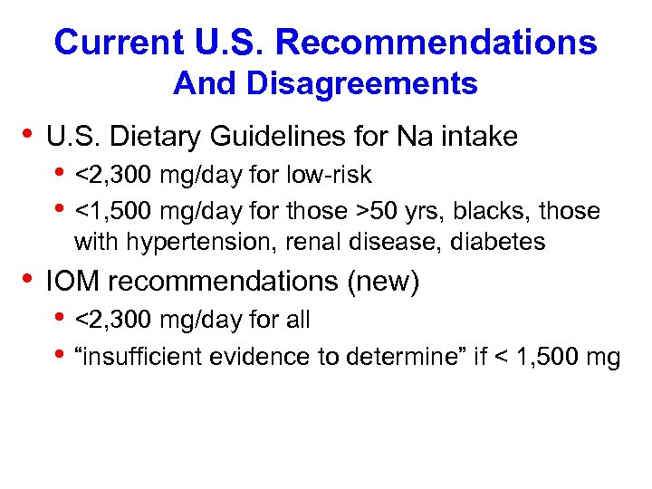 Current U. S. Recommendations And Disagreements • U. S. Dietary Guidelines for Na intake • <2, 300 mg/day for low-risk • <1, 500 mg/day for those >50 yrs, blacks, those with hypertension, renal disease, diabetes • IOM recommendations (new) • <2, 300 mg/day for all • “insufficient evidence to determine” if < 1, 500 mg