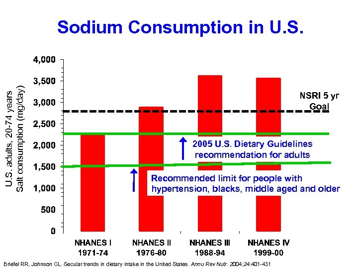 U. S. adults, 20 -74 years Salt consumption (mg/day) Sodium Consumption in U. S. NSRI 5 yr Goal 2005 U. S. Dietary Guidelines recommendation for adults Recommended limit for people with hypertension, blacks, middle aged and older Briefel RR, Johnson CL. Secular trends in dietary intake in the United States. Annu Rev Nutr. 2004; 24: 401 -431