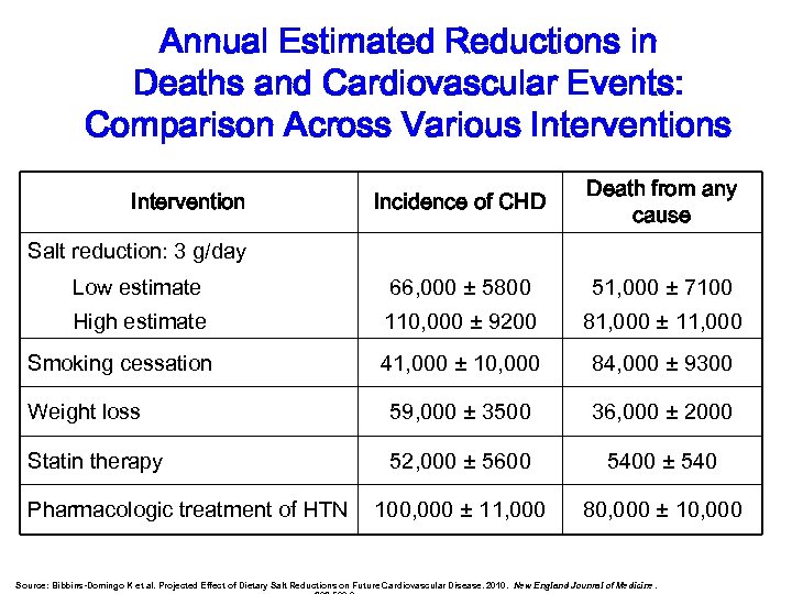Annual Estimated Reductions in Deaths and Cardiovascular Events: Comparison Across Various Interventions Incidence of CHD Death from any cause Low estimate 66, 000 ± 5800 51, 000 ± 7100 High estimate 110, 000 ± 9200 81, 000 ± 11, 000 Smoking cessation 41, 000 ± 10, 000 84, 000 ± 9300 Weight loss 59, 000 ± 3500 36, 000 ± 2000 Statin therapy 52, 000 ± 5600 5400 ± 540 100, 000 ± 11, 000 80, 000 ± 10, 000 Intervention Salt reduction: 3 g/day Pharmacologic treatment of HTN Source: Bibbins-Domingo K et al. Projected Effect of Dietary Salt Reductions on Future Cardiovascular Disease. 2010. New England Jounral of Medicine.