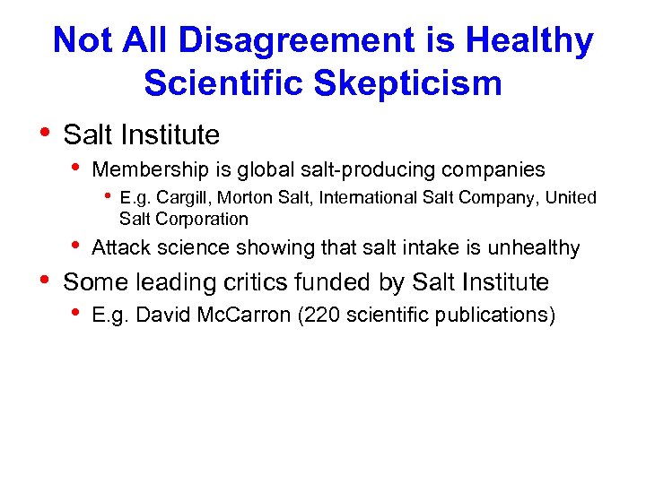 Not All Disagreement is Healthy Scientific Skepticism • Salt Institute • Membership is global salt-producing companies • • • E. g. Cargill, Morton Salt, International Salt Company, United Salt Corporation Attack science showing that salt intake is unhealthy Some leading critics funded by Salt Institute • E. g. David Mc. Carron (220 scientific publications)