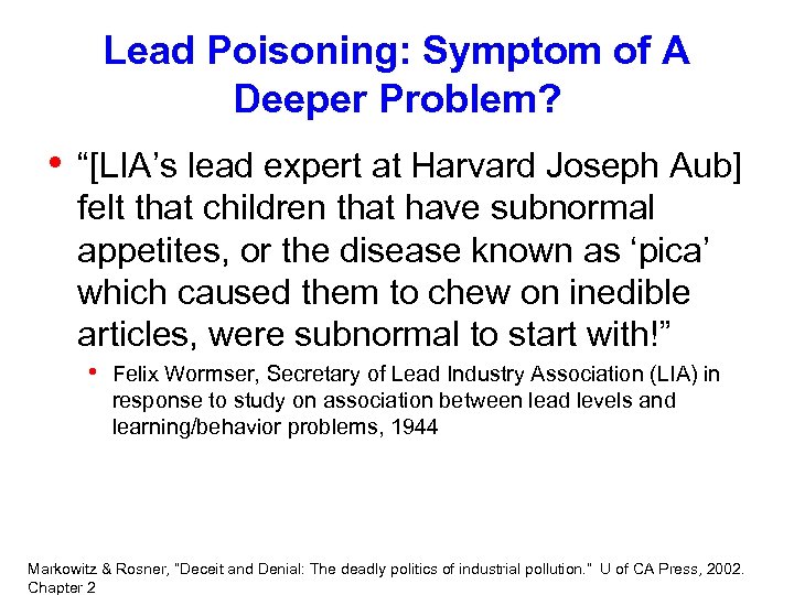 Lead Poisoning: Symptom of A Deeper Problem? • “[LIA’s lead expert at Harvard Joseph Aub] felt that children that have subnormal appetites, or the disease known as ‘pica’ which caused them to chew on inedible articles, were subnormal to start with!” • Felix Wormser, Secretary of Lead Industry Association (LIA) in response to study on association between lead levels and learning/behavior problems, 1944 Markowitz & Rosner, “Deceit and Denial: The deadly politics of industrial pollution. ” U of CA Press, 2002. Chapter 2